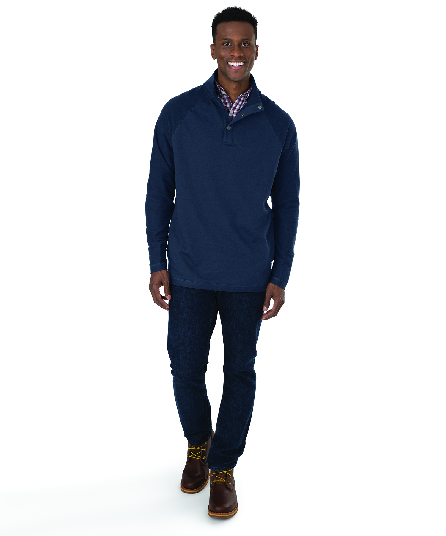 Convenient quarter length snap placket with stand-up collar and gunmetal snaps for easy on/off