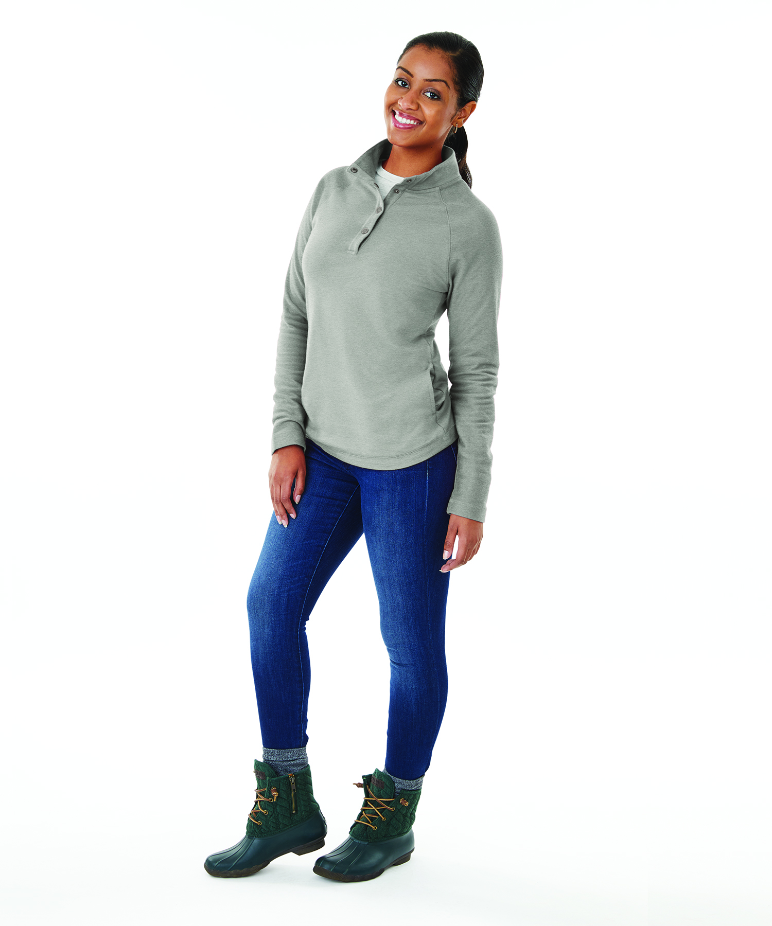 Convenient quarter length snap placket with stand-up collar and gunmetal snaps for easy on/off